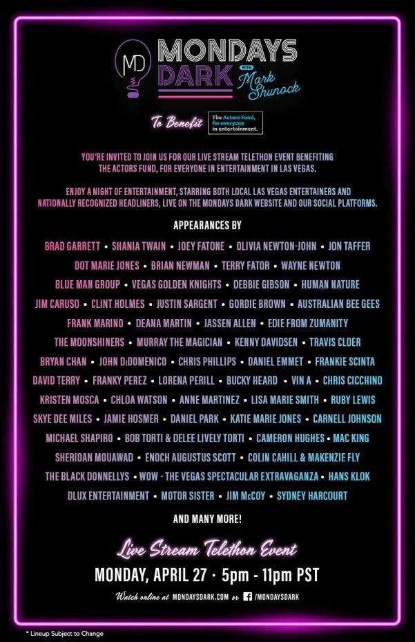 VEGAS UNFILTERED 4/16/20 - Thanks to the team at Mondays Dark and The Actors Fund, Sin City s entertainment community will be on the receiving end of founder Mark Shunock s charitable organization for the first time. Thousands of entertainers, artists, and support crew are without work, and very few are receiving temporary compensation to get by. The Actors Fund, best known in Los Angeles and New York City, has partnered with Mondays Dark to help raise money for the Vegas entertainment community during this desperate time.
