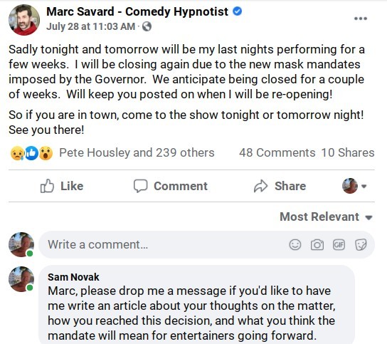 One thing that might stick in your throat, however, is that Savard publicly announced on Facebook that he would be deliberately shutting down his show on August 1st in response to returning mask mandates...despite receiving taxpayer funds to keep it OPEN. I reached out to Savard, offering him a forum to elaborate on this decision, but he never responded. The show is currently scheduled to return on September 4th.