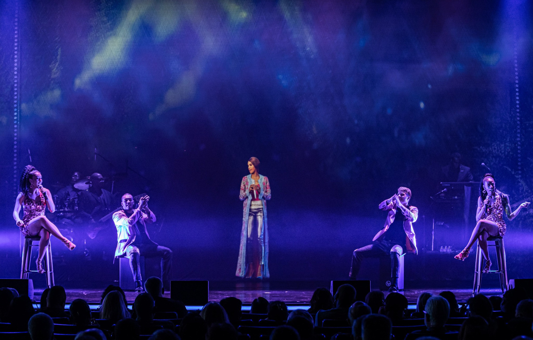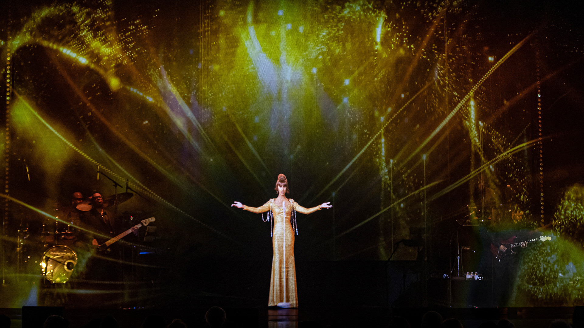 Much of the time, the singer's likeness remains front and center. Its body movements are mostly limited to hand gestures, waving of arms, and plenty of smiles. There are no flashy attempts to dance with live performers, no strolling over to coo into the keyboardist's ear. Like a video game character, Whitney pops in, pops out, then returns in another dress for the next round.
