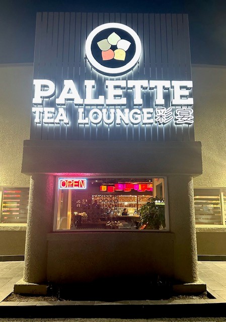 Driving along Spring Mountain Rd at night, the beautifully lit exterior of the new Palette Tea Lounge & Dim Sum comes commandingly into view.