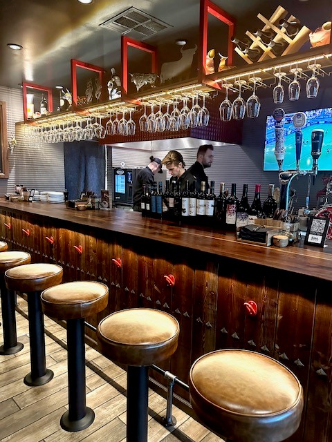 Settle into one of their tufted circular leather booths in the spacious dining room and admire the grand high ceiling, modern lighting fixtures, and the attractive combination of brick, dark wood, and mirrors, not to mention the inviting L-shaped bar.