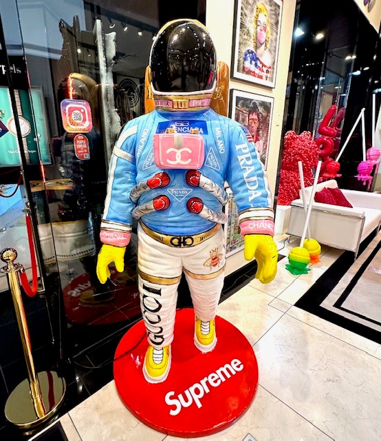 Walking inside, you’re greeted by an Efi Mashiah-created sculpture of an astronaut branded with Prada, Dior, Gucci, Chanel, and Supreme logos. How perfect since it was announced in 2023 that Prada was designing NASA’s new spacesuits for its Artemis III mission in 2025.