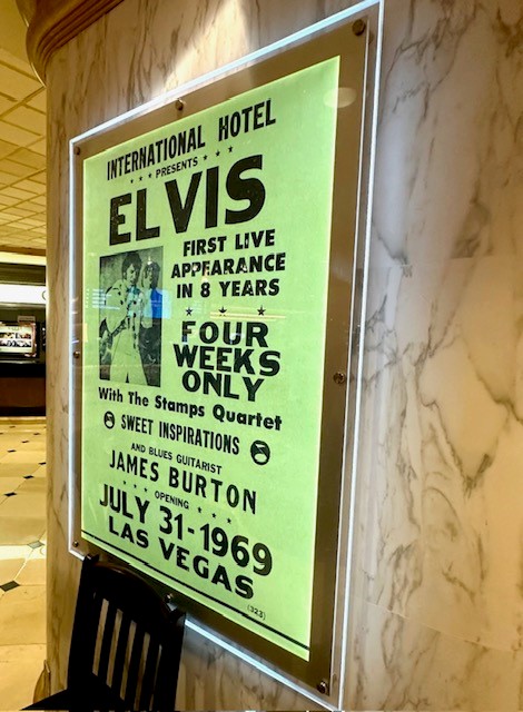 Walking around the vintage-groovy Westgate Las Vegas Resort & Casino, I spotted this poster of Elvis Presley’s “first live appearance in 8 years,” promoting his four-week engagement that began there on July 31, 1969.
