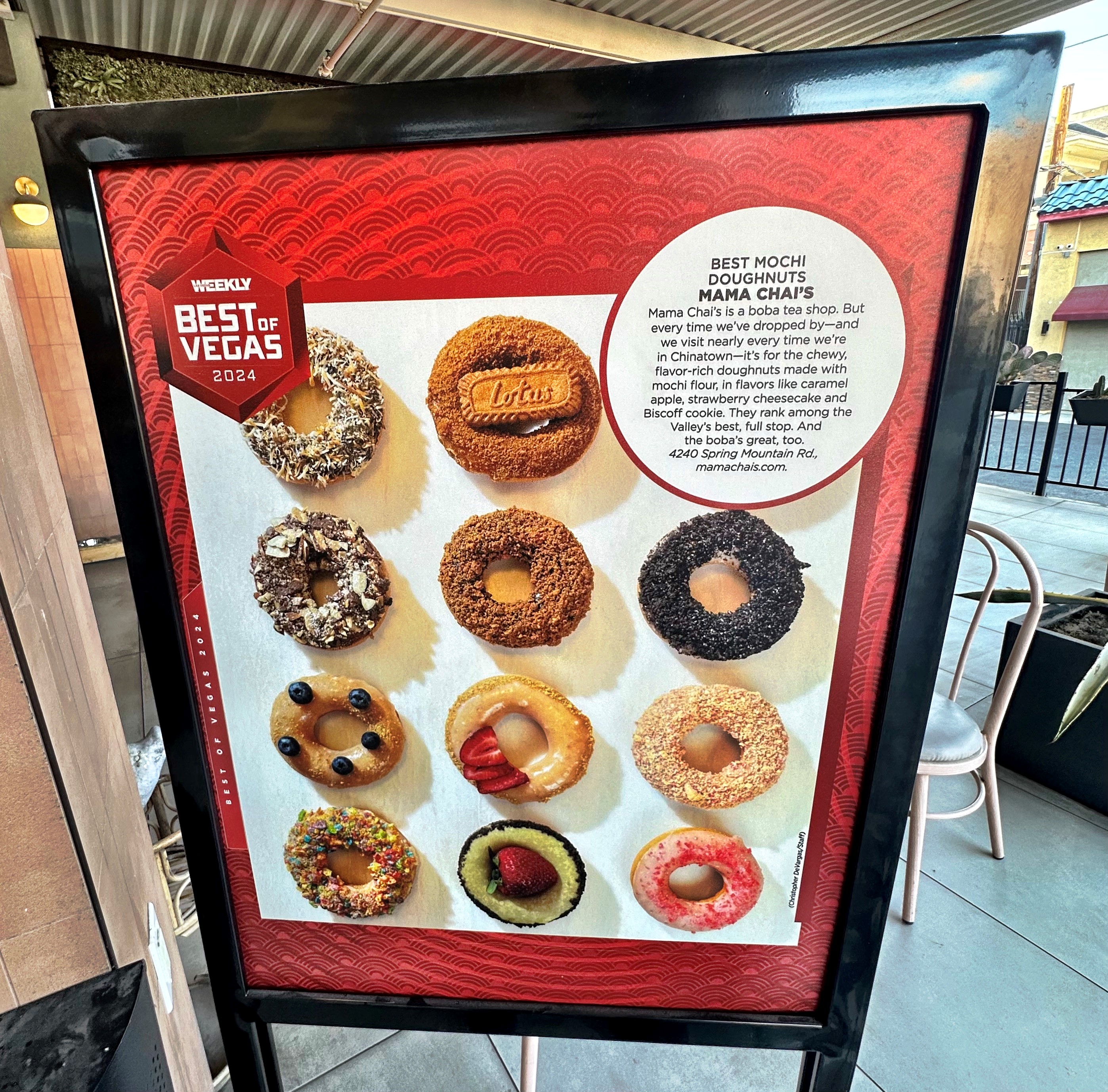 Out on Mama Chai’s expansive patio, one of the best in Vegas, you can relax on comfortable furniture and enjoy the donuts, plus salted fresh milk and fresh fruit teas, coffee, and smoothies.