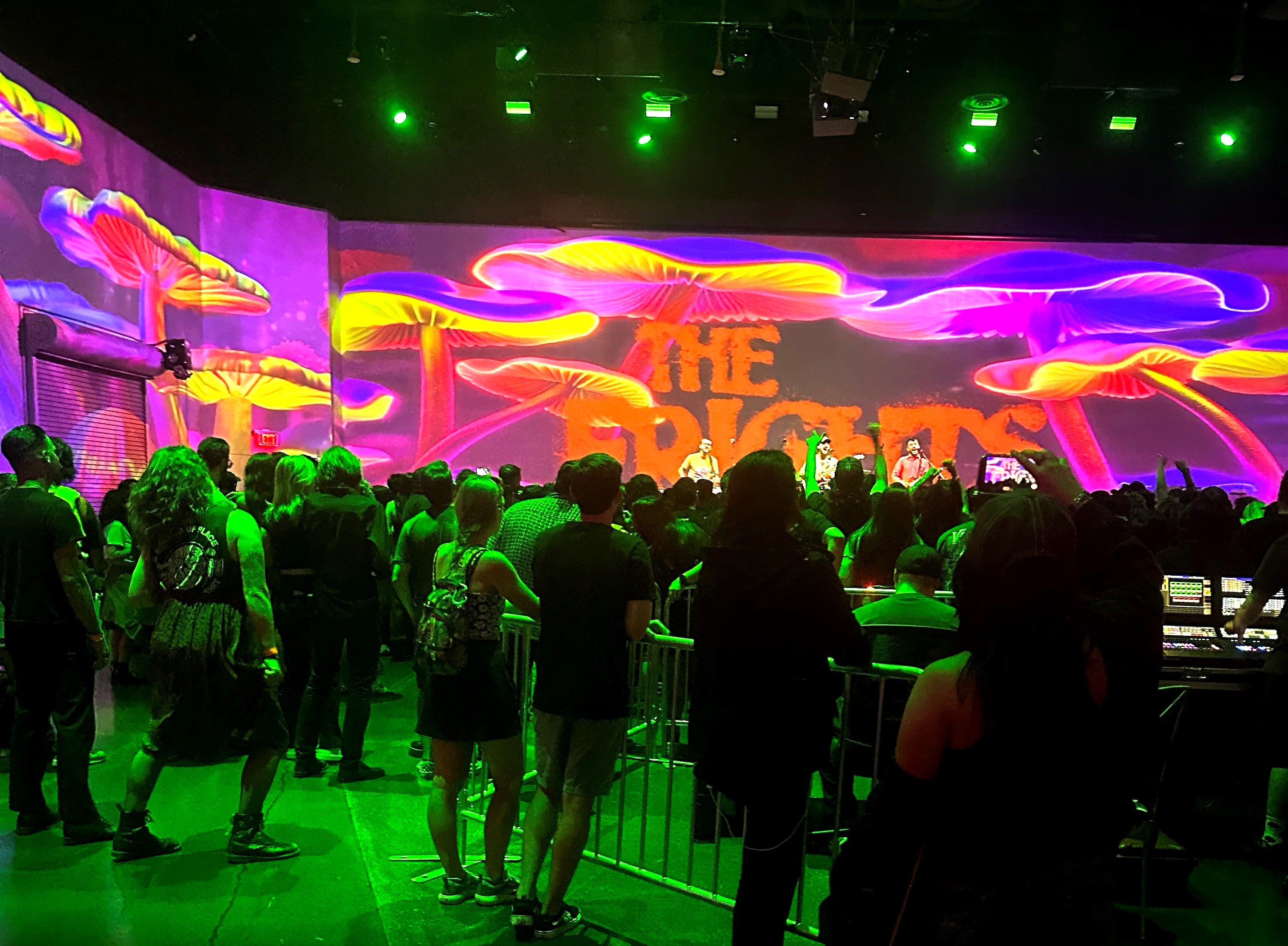 The Portal venue inside AREA15 is a distinctive place to see musical acts perform—its 360-degree projection-mapped room envelops concertgoers with swirling imagery (like a mini-Sphere). While the visuals were not elaborate for a recent show by two Southern CA bands—The Frights (San Diego) and Surely Tempo (Santa Ana)—it was still worthwhile to see these proudly indie rockers play in this ballroom-like space where a sizeable young crowd moved about freely.