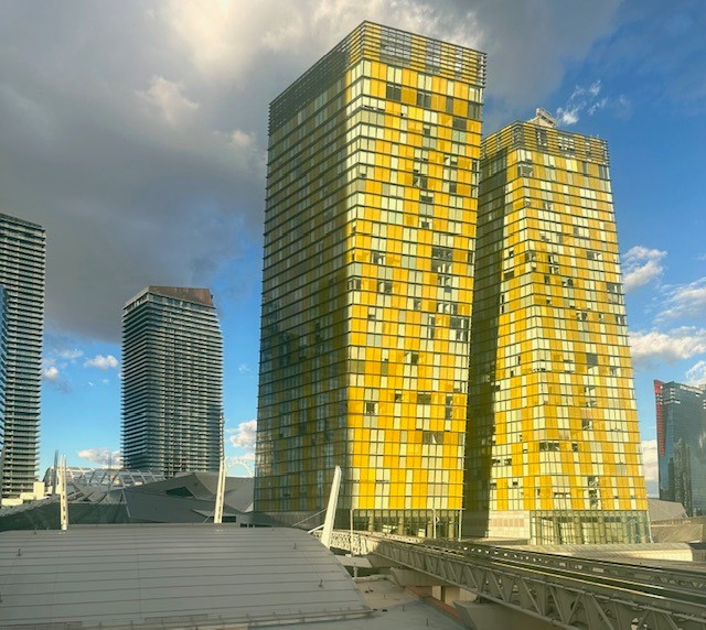 Those are the twin 37-story all-residential condominium towers that tilt (impossibly, to my mind) in opposite directions at a five-degree angle. To the left in this photo are the two majestic towers of the Cosmopolitan.
