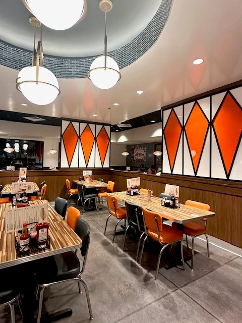 The architecture is not as mid-century Googie-wondrous as the truly iconic La Cienega Blvd location (which opened in 1957). Still, there are enough neo-mid-century touches to keep folks visually engaged, like the bold orange color used throughout and the geometrically patterned visuals. As someone who lived in Los Angeles for some 40 years, it’s both exciting and heartwarming to see Norms’ self-described neon “iconic sawtooth pennant sign” glowing while cruising down Charleston.