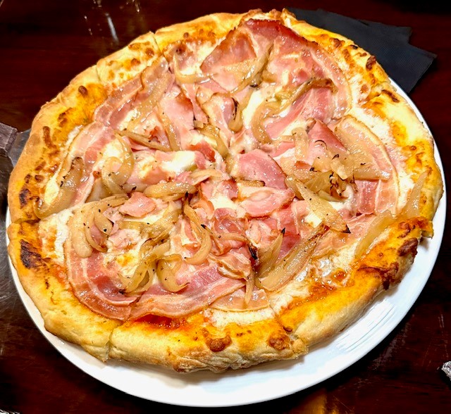 The environment here is warm and cozy, with brick, wood, and circular red leather tufted booths. Our three choices on a recent evening were just as striking as the food at the Aromi mothership: the Pappardelle Pesto, the Rigatoni Vodka with Italian Sausage, and the Porchetta Pizza accented with caramelized onions and truffle oil.