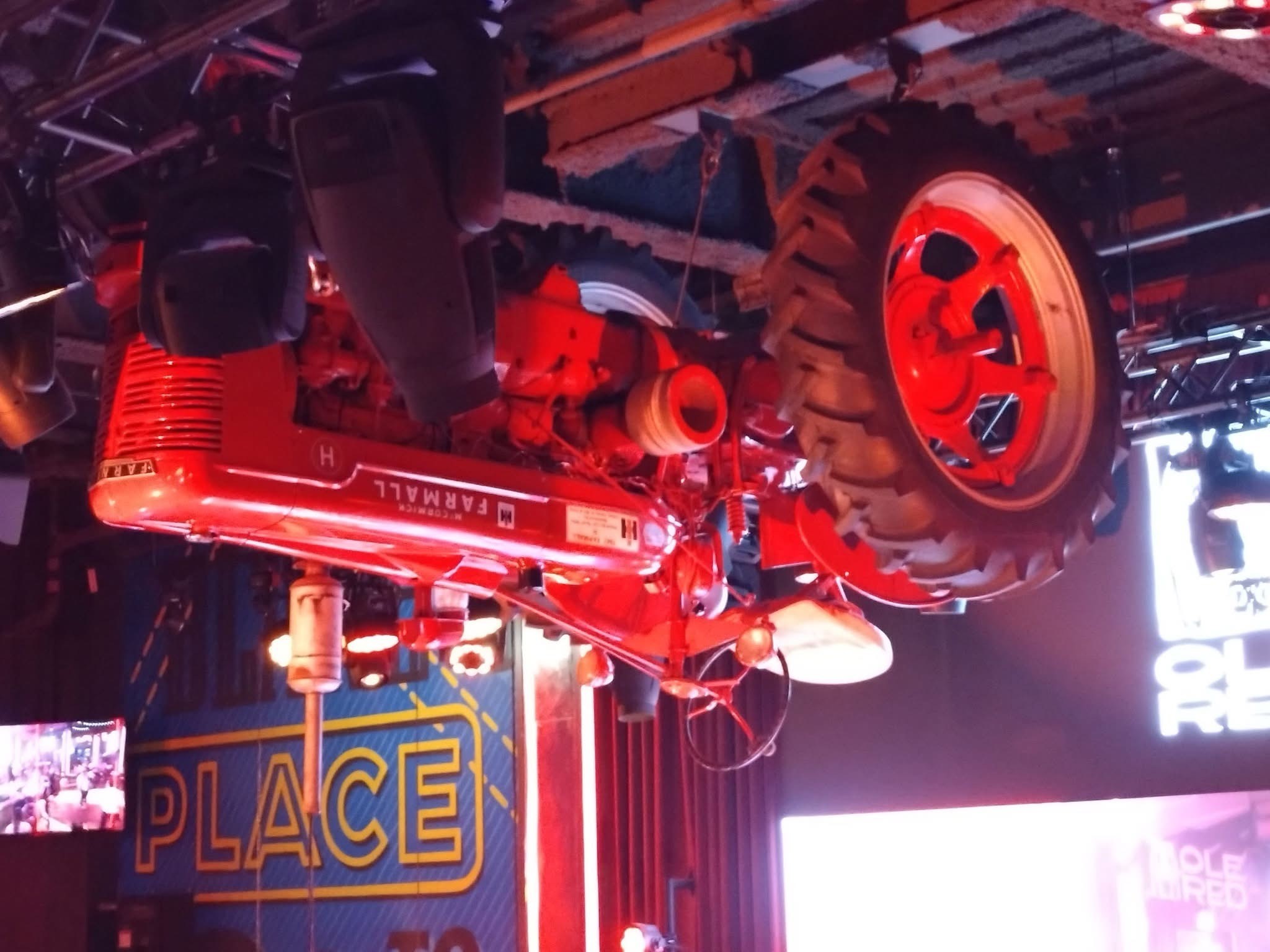 If you go, don’t forget to point your eyes to the ceiling, onto which an upside-down 4500-pound tractor is impossibly mounted. It leads me to think that Ole Red has, uh, plenty of insurance.