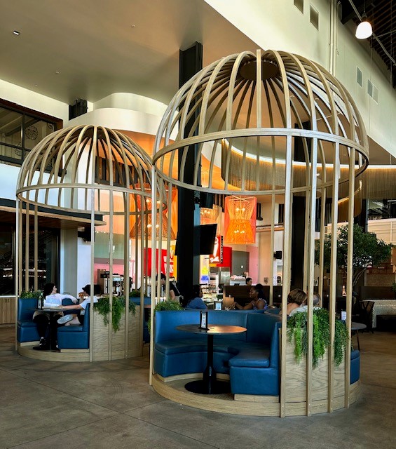 We had excellent chicken tikka masala with basmati rice from Dhaba Ji (a spin-off of its flagship Santa Barbara restaurant) as well as fried chicken tenders, French fries, and the transcendent mac and cheese from the Oakland-originated Kowbird. It’s fun to grab a table in this soaring modern space awash with light and then order (via your phone) from many “food concepts” whose chefs work out of a communal kitchen. The service is notably helpful, particularly for the tech-challenged.