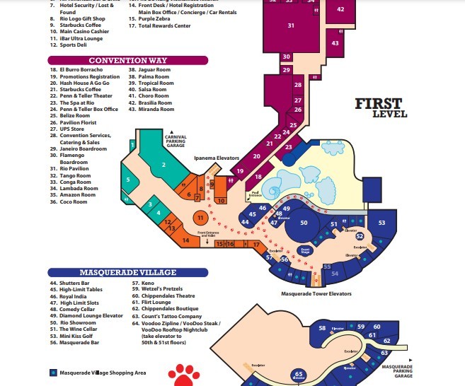 The situation gets even more frustrating once additional towers are added to an original building. Such is the case with Rio Las Vegas. Depending on whether you park in their original north garage or east-facing Masquerade garage, you'll need to navigate twisting corridors or banks of escalators before reaching the main interior. Then it's a parade through the casino to find the front desk, which is always understaffed (automated kiosks rarely work, too). After receiving your keys and a property map, it's back through the casino to either the original Ipanema Tower or the instantly recognizable Masquerade Tower.