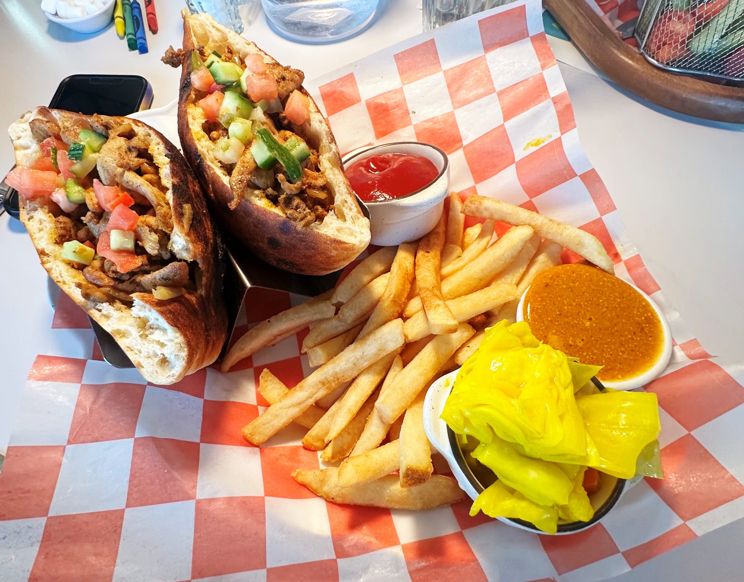 The food here (breakfast, lunch, dinner) is mainly Israeli and Mediterranean, with various pastas in the mix. The chicken Shawarma pita sandwich (with caramelized onions) and pasta verde (with broccolini, pumpkin seeds, and pesto, topped with a poached egg) were standouts on my first visit here.