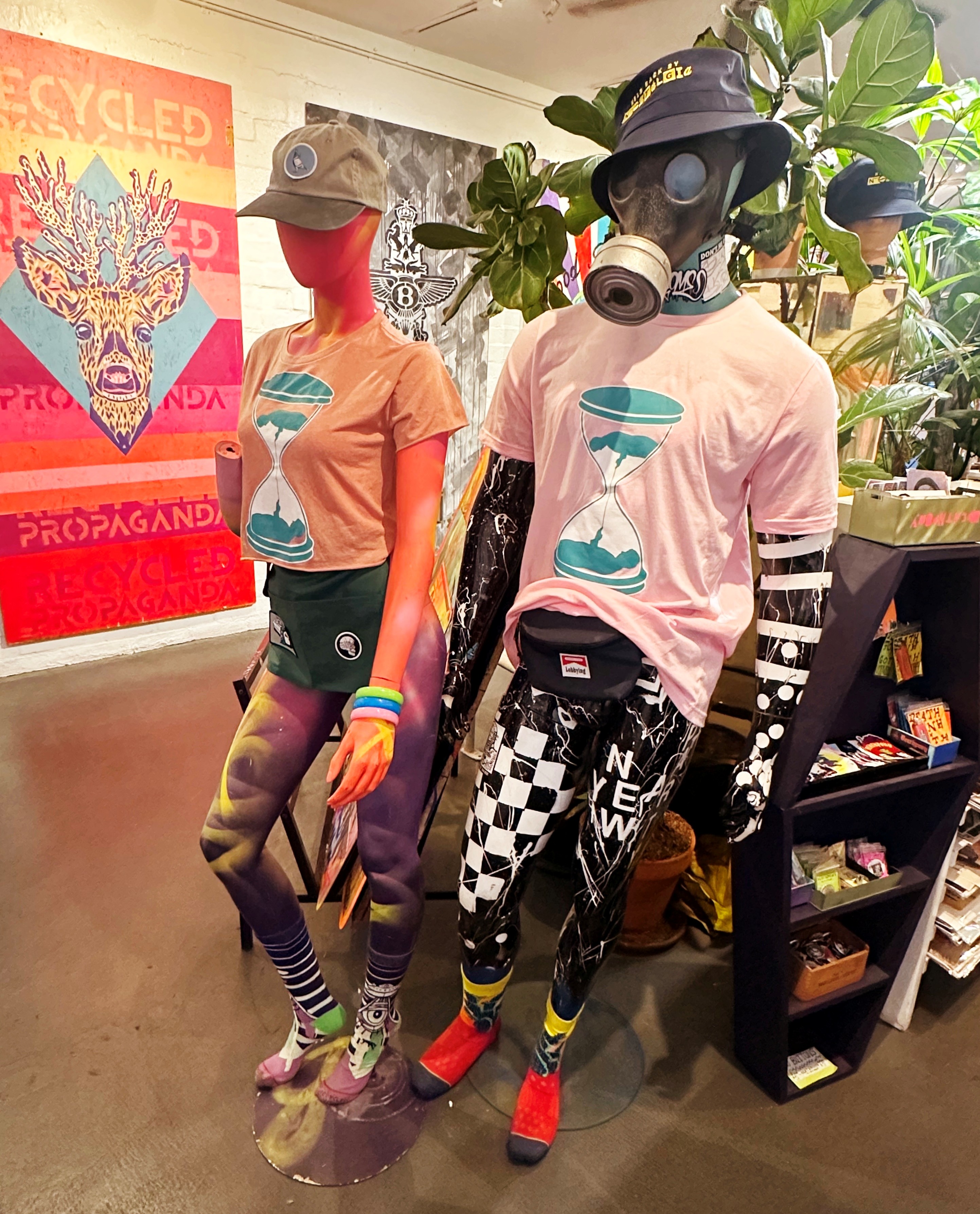 Is time running out for everyone? At the reliably provocative Recycled Propaganda gallery/store in the Arts District, I caught up with this striking couple and they had lots to say on the subject. Recommendation: cue up David Bowie’s 1972 apocalypse-themed song “Five Years”: “We’ve got five years, my brain hurts a lot/Five years, that’s all we got.”