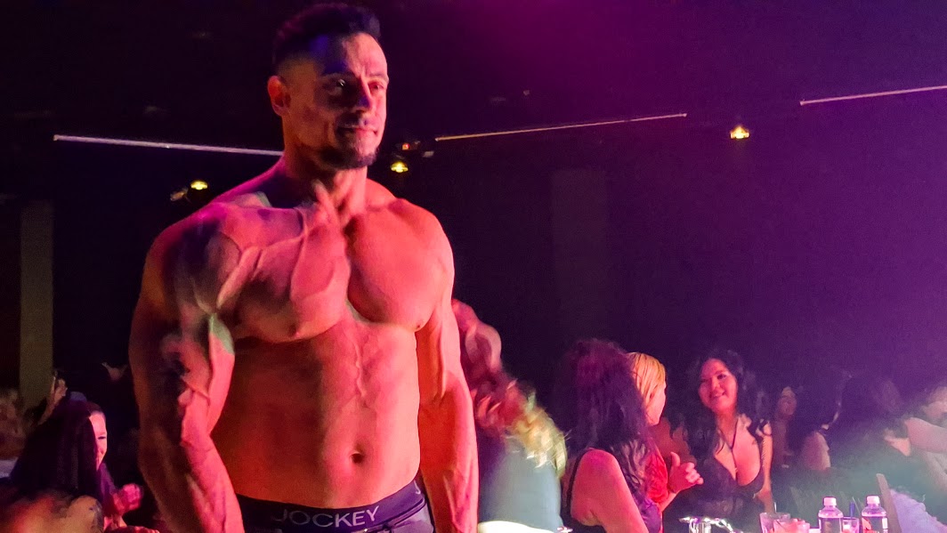 The Peppermint Hippo Gentlemen’s Club on Las Vegas Blvd may be a “stripper joint”, but you can now add a sub-category of “Meat Market.” Model, bodybuilder, entrepreneur, producer, and entertainer A.J. Trunk (above) has launched a new experience at the ‘Hippo for ladies, and it’s a testosterone-fueled overload.