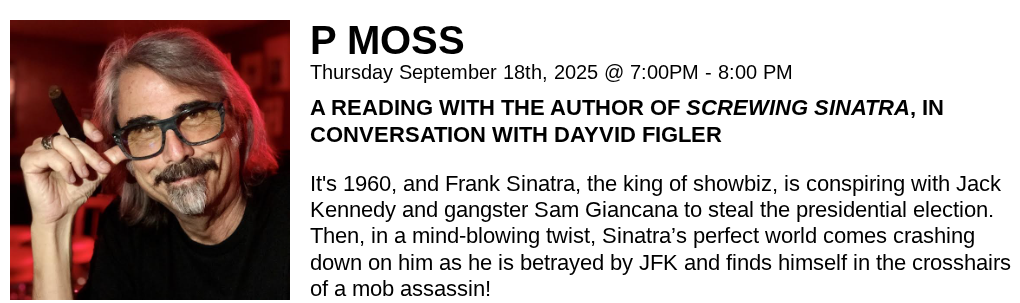 On September 18, The Writer’s Block will welcome author P Moss, who is promoting the release of his latest surreal novel. It’s called SCREWING SINATRA…and the story sounds totally wild.