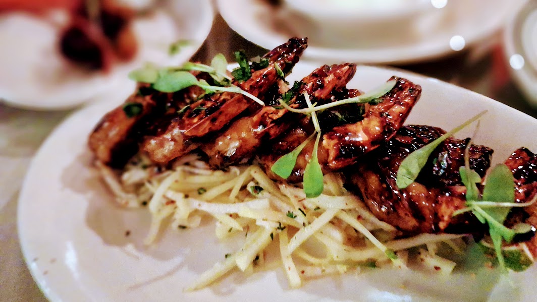 Next came a beautiful Dirty Martini Salad, made with bibb lettuce, olives, Roquefort, pickled onions, sweet drop peppers, and a Juniper Vinaigrette. Appetizers included Bone Marrow Bites (with cherry braised short rib, pickled onion, and chives, above right), Filet Tartare Tacos, and Thai Shrimp over mango-jicama slaw (below).