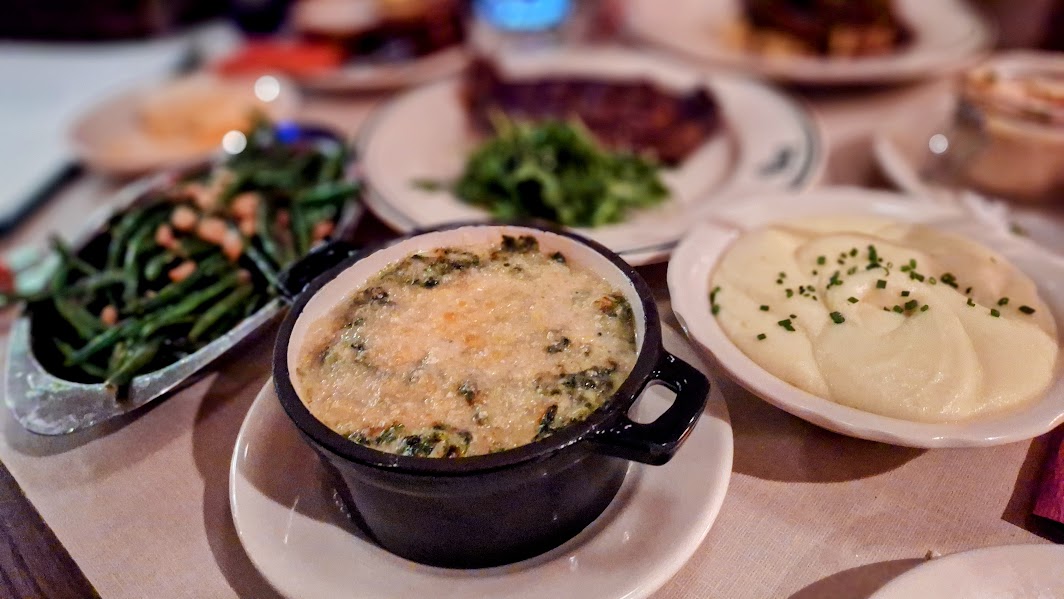Steakhouse-style shareable sides include Green Beans, Creamed Spinach, and Potato Puree