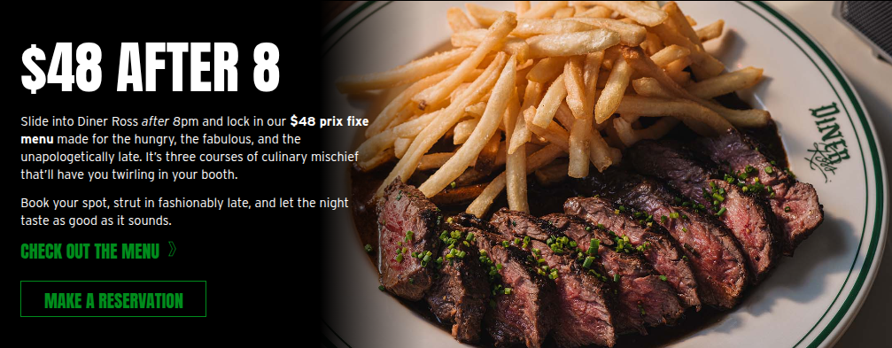 Diner Ross Steakhouse is a come-as-you-are elevated experience that’s high on pleasure without the pretense. And if you arrive after 8 pm, there’s a three-course dinner special for only $48 per person.
