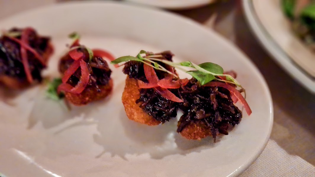 Other offerings under Apps & Smalls include Oysters On The Rocks, Coconut Seabass Ceviche, Peaches & Burrata, Fried Olives (with pork sausage and sage), and a Baked Potato Croquette.