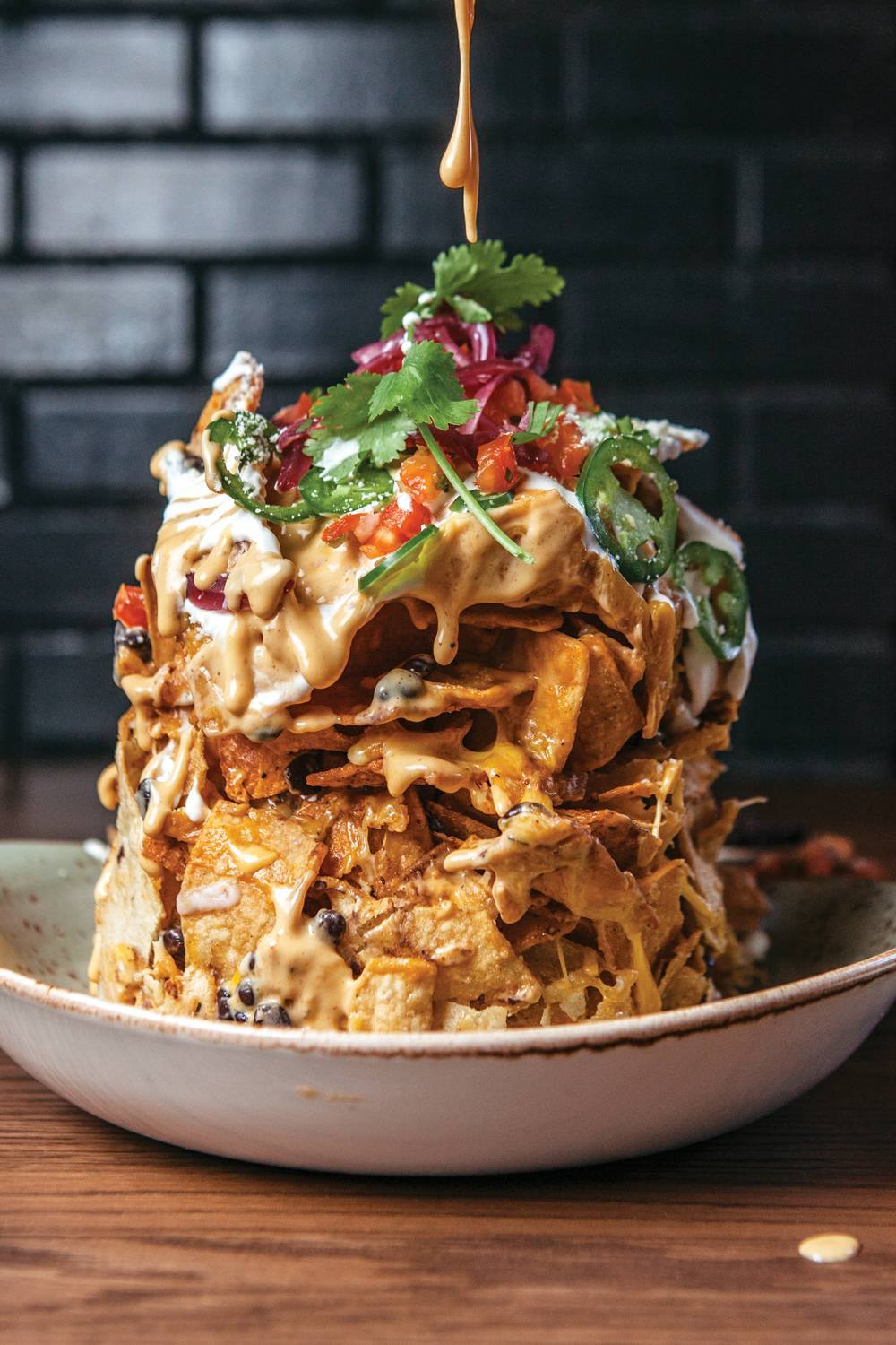 Guy Fieri's Flavortown Sports Kitchen serves nachos piled high in a metal cylinder, layered with ground beef, chips, lettuce, sauce, onion, tomato, and pickle. Guests can order the cheeseburger nachos with cheddar, smoked brisket, barbecue sauce, and cilantro. The two go for $26, and they’re served without the cylinder.