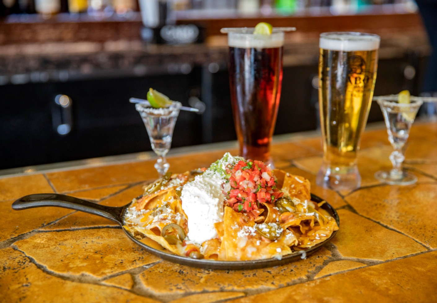 Cabo Wabo Cantina has an amazing nacho platter that comes loaded with a cheese blend, jalapenos, beans, cotija cheese, queso sauce, guacamole, and sour cream. Diners also have the option to choose their protein, like shrimp or grilled chicken, to make it a balanced meal.