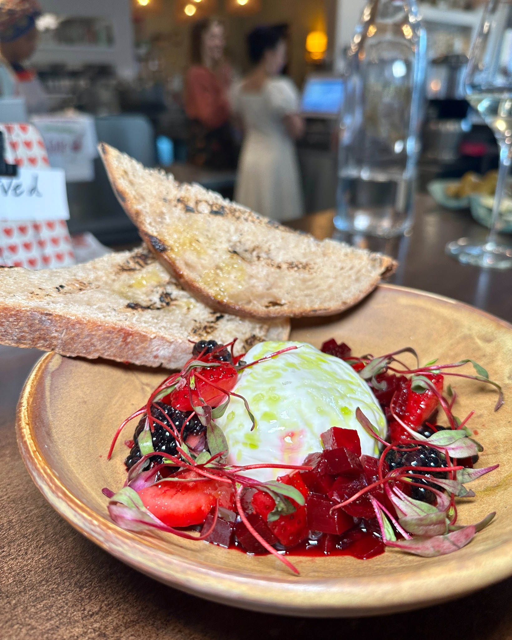 Burrata, berries, beets, and basil oil.[/caption]