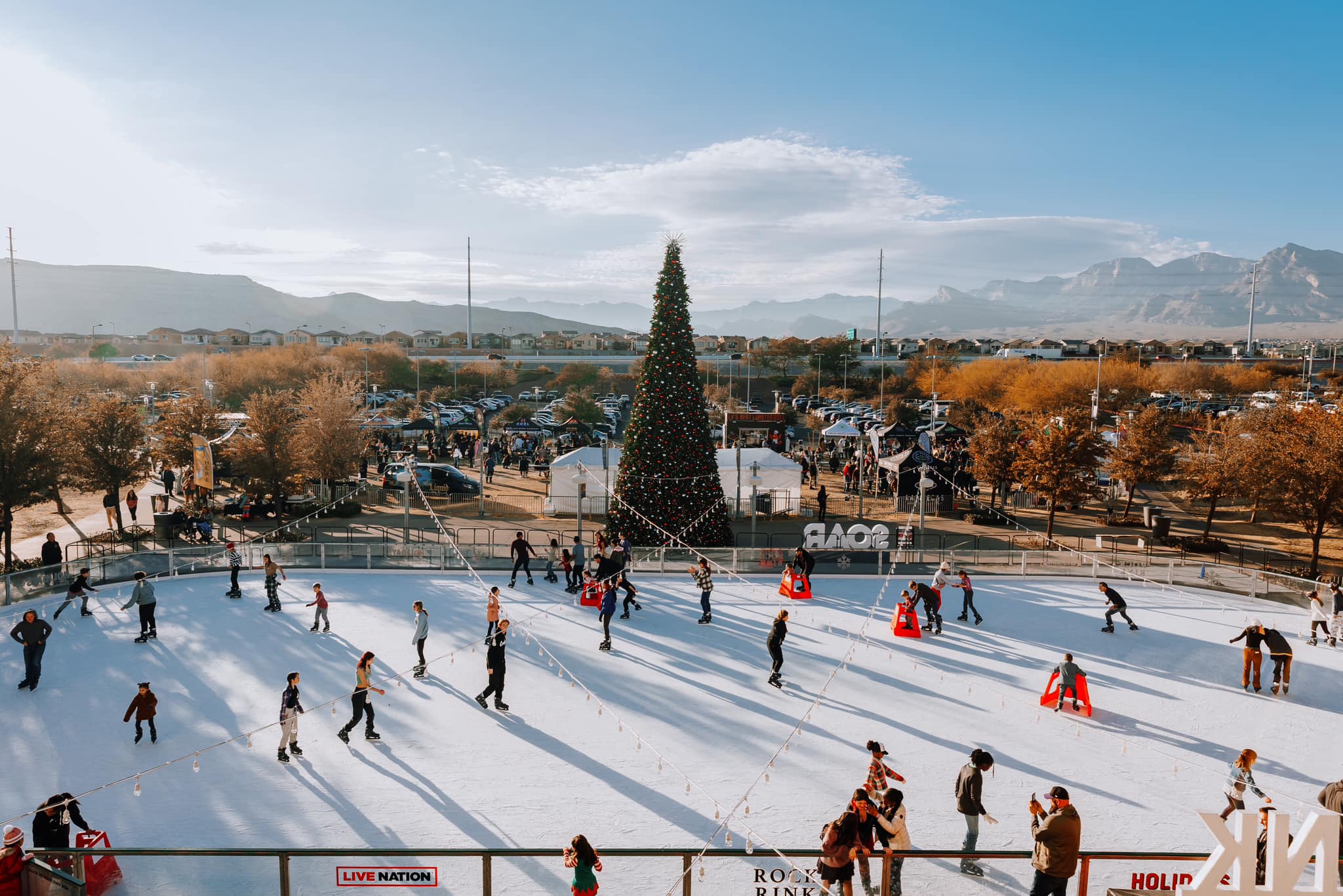 Enjoy skating at Summerlin Rock Rink from November 10 to January 15. The 8000-square-foot rink is covered with natural ice and is next to a 40-foot Christmas tree. Many overhead lights shine on the ice. You also get to enjoy festival holiday music and see the holiday train that circles the rink.