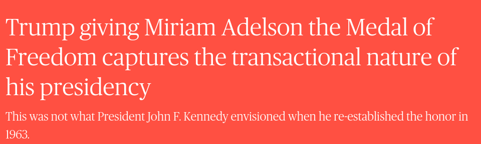 “Adelson’s medal reflects a growing pattern: one of Trump awarding a large majority of such medals and even pardons to supporters, to Republicans, and to recipients who fit his political agenda.”