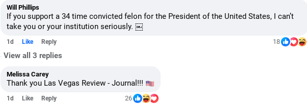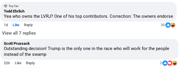 So far, Mr. Katsilometes has not responded. I'll update developments with him in the next segment. At VEGAS 411, we're encouraged to share our opinions without influence or pressure. This site does not accept outside advertising, nor do we publish "paid content". As Deputy Editor of VEGAS 411, I hope that all journalists, columnists, and media personalities will continue to present the truth with integrity...and not feel pressured to echo the voices of biased owners. In Part Two, we'll share reader reactions to the Trump/LVR-J endorsement. Here are a few:
