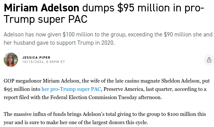 Trump also used the controversy surrounding Adelson's selection to disrespect military veterans while sprinkling in a dose of misogyny:"When we gave her the Presidential Medal of Freedom… It’s the equivalent of the Congressional Medal of Honor— it’s actually much better because everyone who gets the Congressional Medal, they’re soldiers. They’re either in very bad shape because they’ve been hit so many times by bullets or they’re dead. She gets it and she’s a healthy beautiful woman." - Donald J. Trump 8/15/24